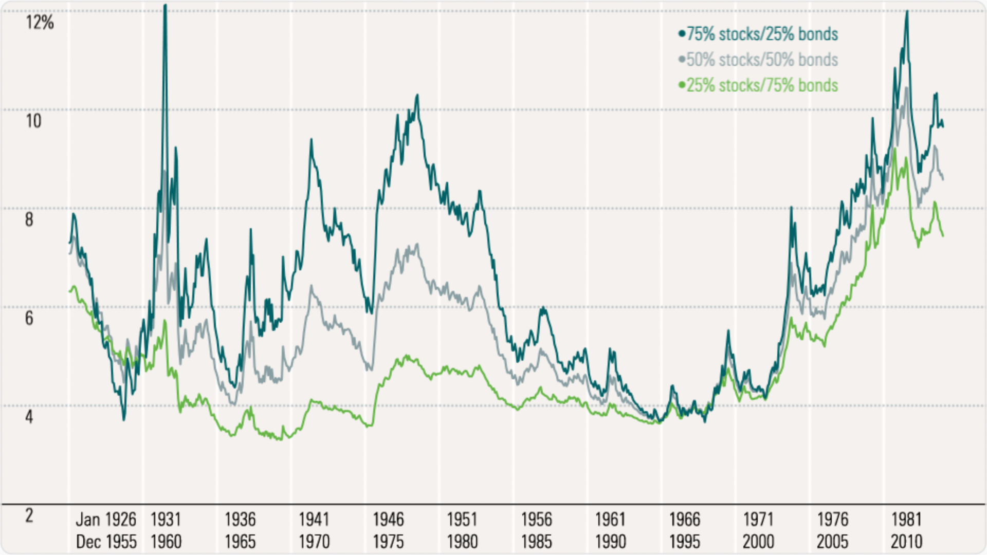 Low inflation and low investment returns are correlated. Whether one causes the other, it’s unclear. Kindof a chicken or the egg problem. I’ll let economists debate the reasons for it, but where you have low inflation, real investment returns are lower.